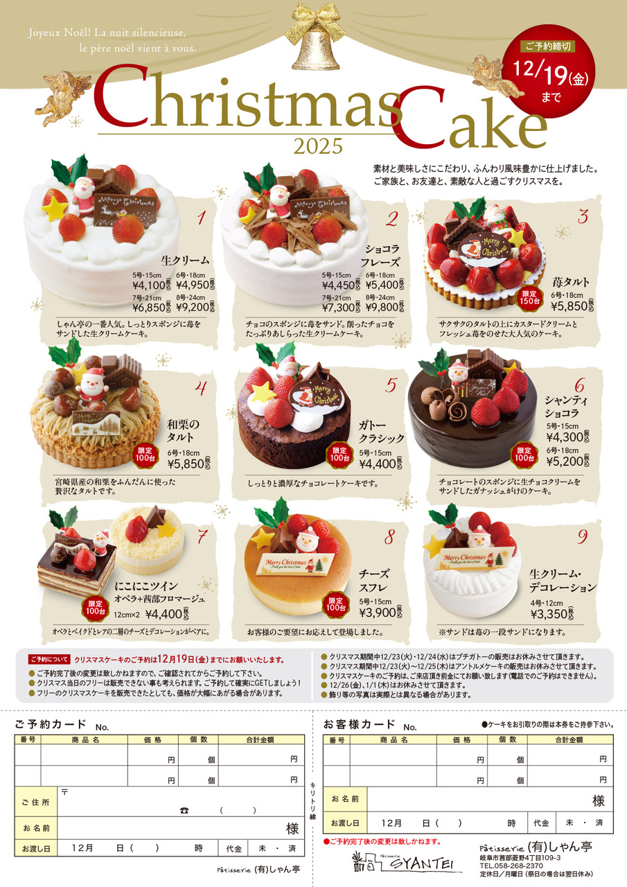 ●クリスマスケーキのご予約は、ご来店頂き、前金にてお願い致します。(電話でのご予約はできません。)